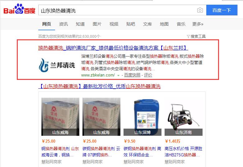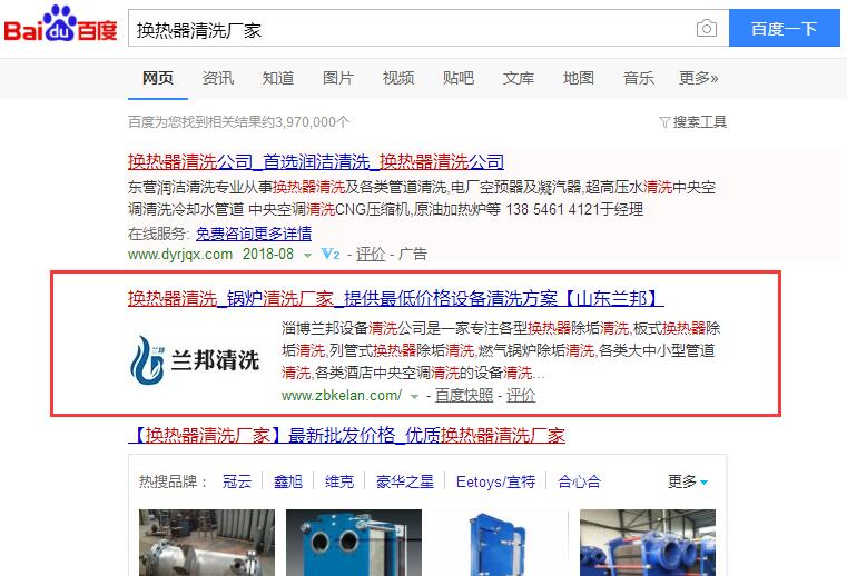 與此同時,山東換熱器清洗,換熱情清洗廠家等詞都排在百度首頁第一名。